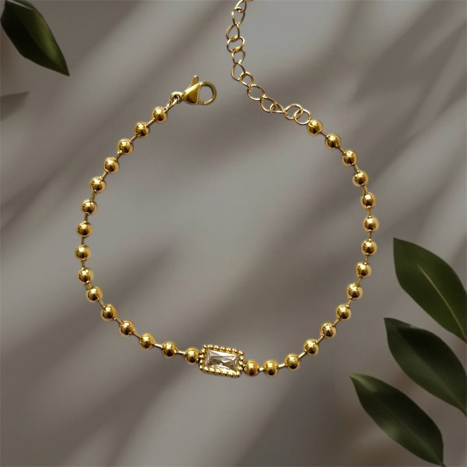 Add a pop of sparkle to your style with this playful ball chain bracelet featuring a dazzling center stone. Perfect for layering or wearing solo, its lightweight design dances on your wrist for a fun, effortless look anytime. Shine bright with a touch of charm that’s ready for every adventure!