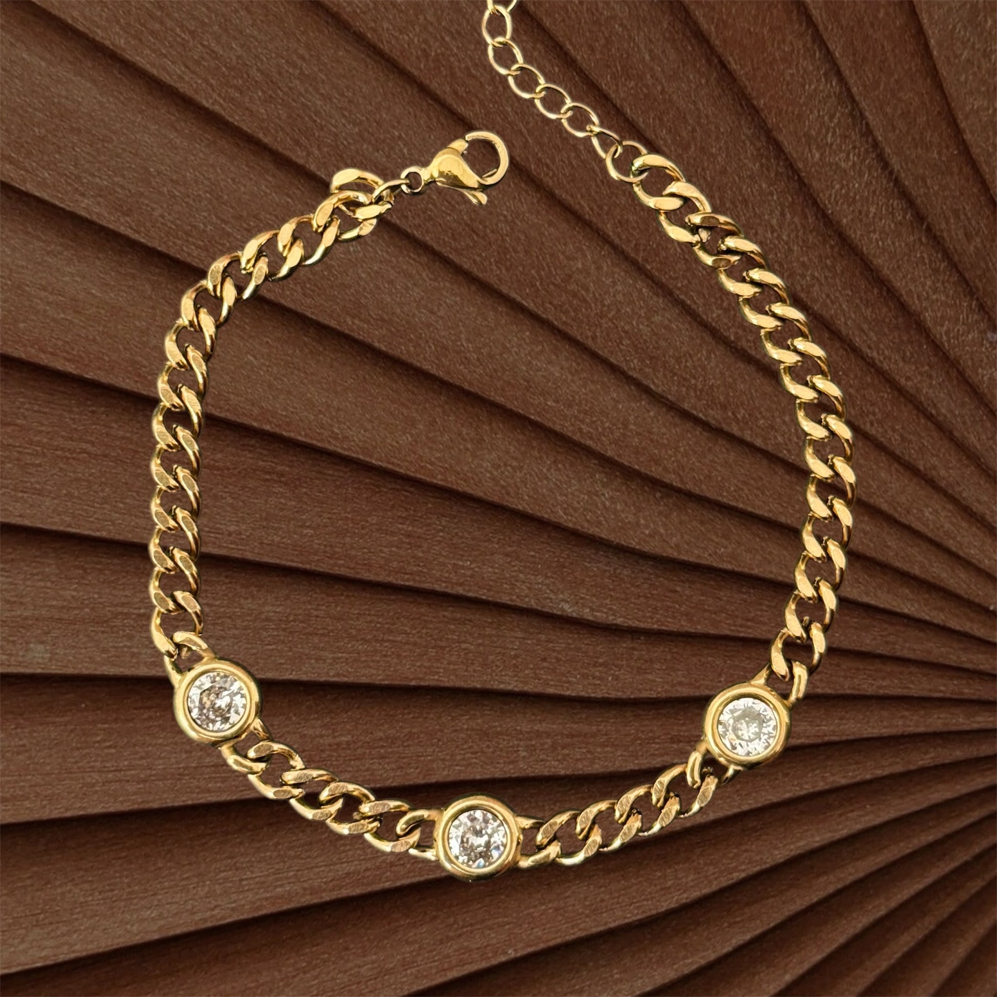 Add a touch of sparkle and fun to any outfit with this three-stone chunky crystal bracelet. Its bold design features three dazzling stones that catch the light beautifully, making it the perfect accessory to brighten your day