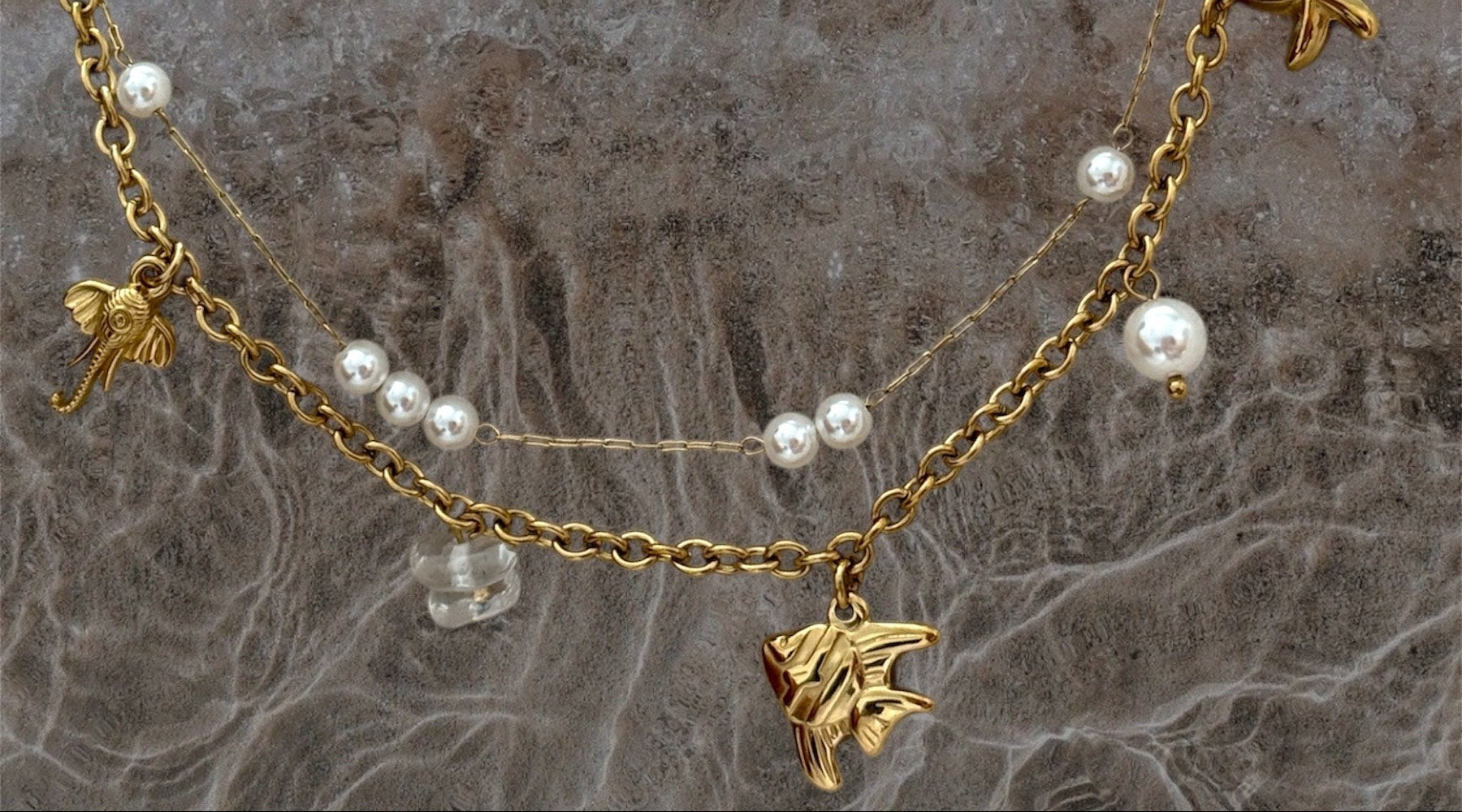 Dive into dual-layer elegance with the Mer Charm Necklace. This playful piece features a delicate pearl strand paired with a charm layer showcasing three whimsical charms that add personality and movement. Layer it solo for subtle sophistication or stack it with other pieces for a bolder statement. Perfect for those who love mixing textures and telling their story through jewelry.
