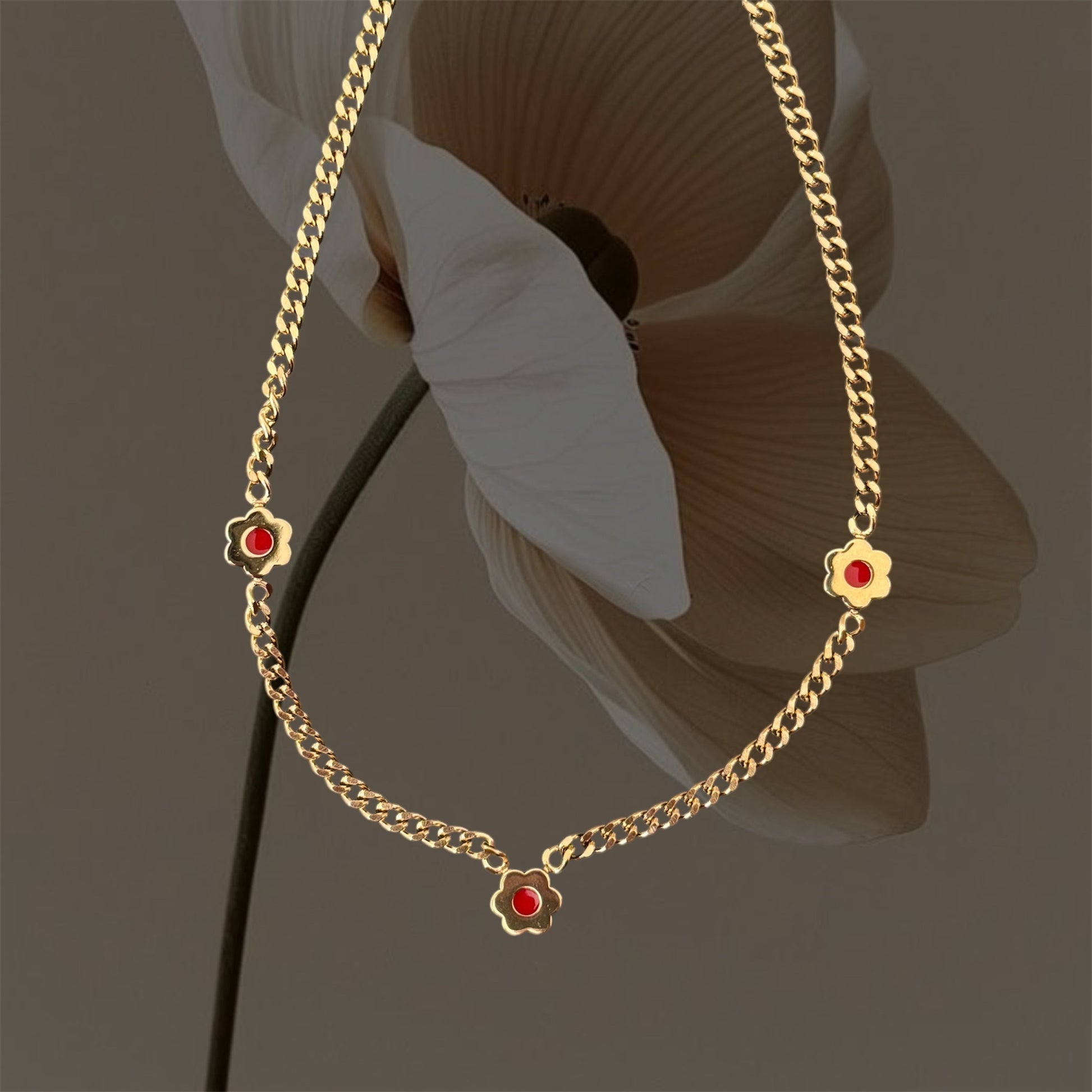 Add a burst of springtime charm to your look with this playful necklace featuring three flowers linked by a chunky chain. Perfect for brightening up any outfit, its bold yet whimsical design brings a fresh and fun vibe to your everyday style.